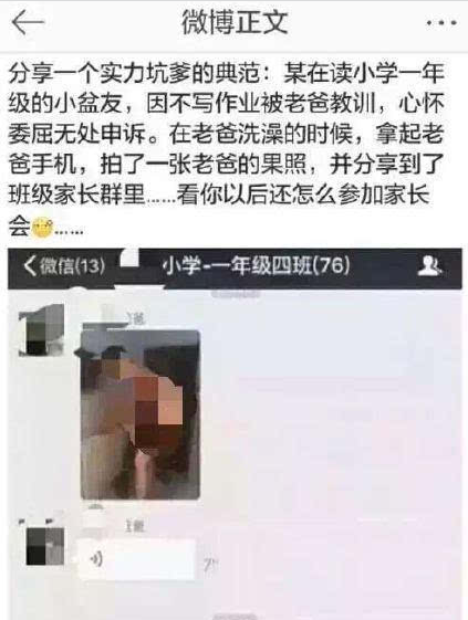 最近有网友爆料,一名一年级小学生因不写作业被老爸教训,气愤之下,趁着老爸洗澡时,拍下裸照并传到班级家长群。事后家长在群里四处灭火道歉,称是小孩不懂事闹着玩。网友调侃,这是年度“实力坑爹”。