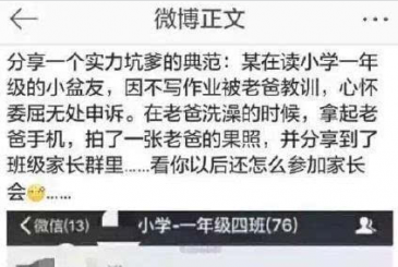 2015-12-19最近有网友爆料,一名一年级小学生因不写作业被老爸教训,气愤之下,趁着老爸洗澡时,拍下裸照并传到班级家长群。事后家长在群里四处灭火道歉,称是小孩不懂事闹着玩。网友调侃,这是年度实力坑爹。